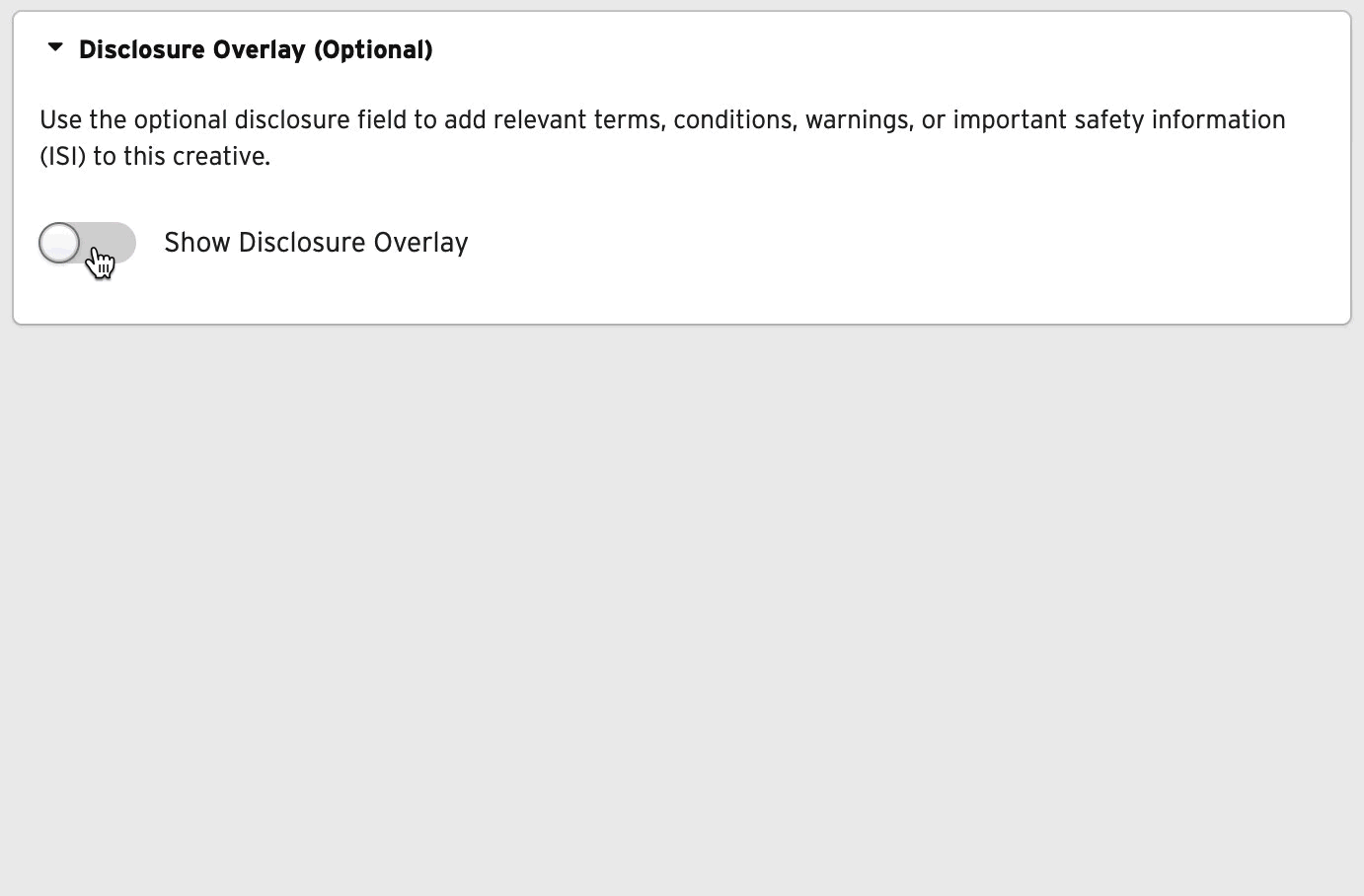 Extended Disclosure offers a clean, scrollable text layer that integrates directly into the ad format without compromising its visual impact. You can simply toggle it on or off when building an ad. There is no limit to the amount of text you can include in the disclosure.